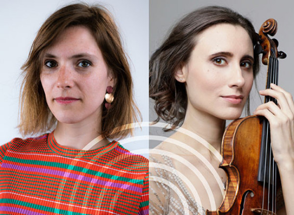 • Portrait photos of Chloé van Soeterstède and Jennifer Pike with a 5 faint white circles overlaid