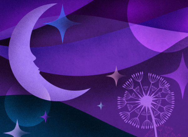 • An artwork image showing a moon and stars and dandelions with dark green and purple colours