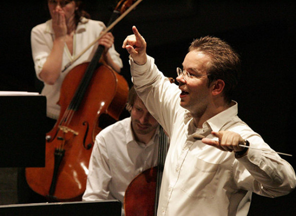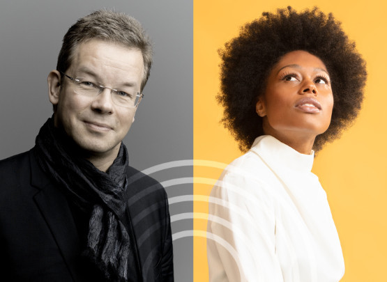 • Portrait photos of Antony Hermus and Isata Kanneh-Mason with 5 faint white circles overlaid